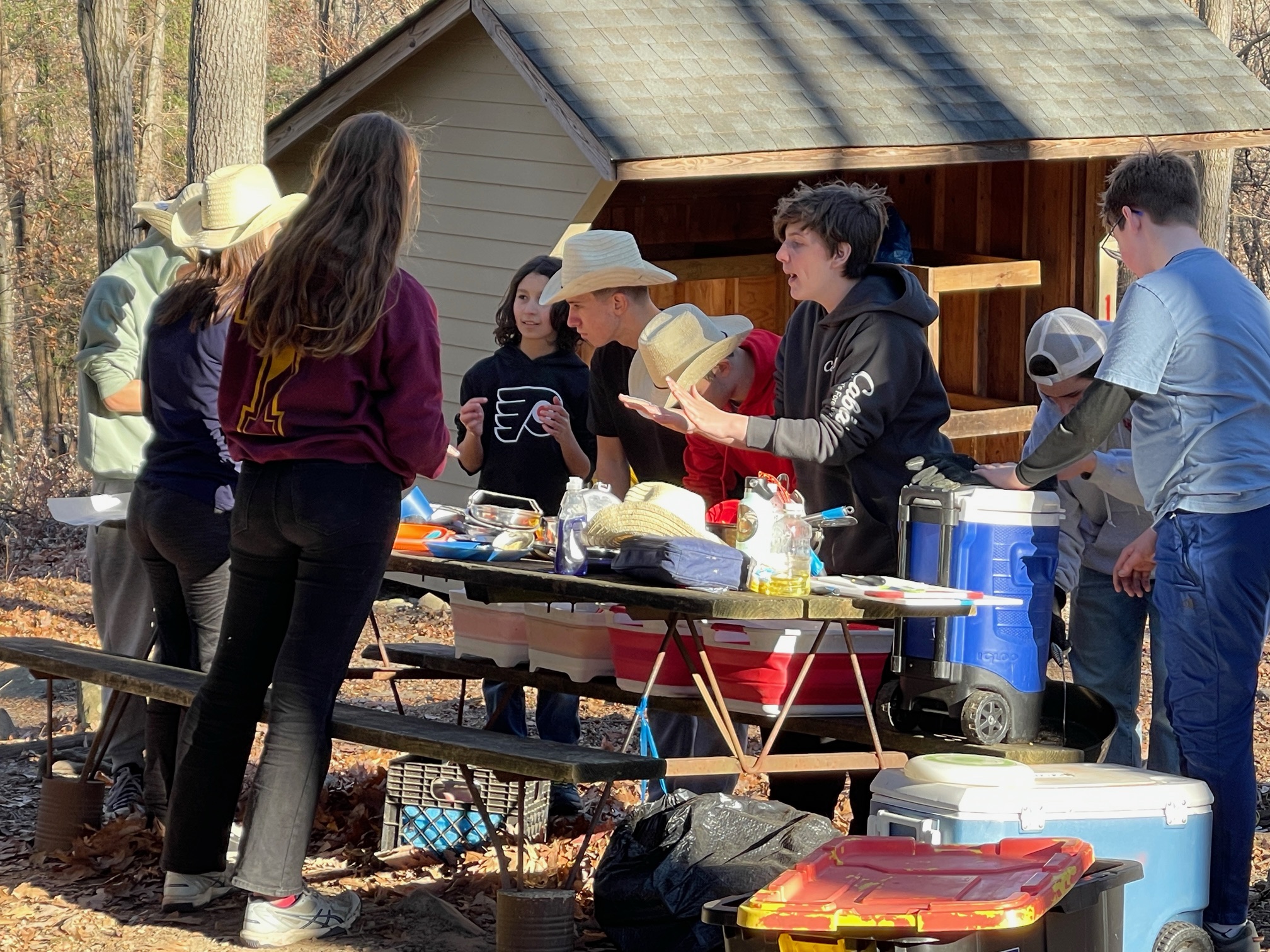 We spent Webelos Weekend at Ockanickon Scout Reservation. There were burn restrictions in place because of high wind and dry conditions so we could not cook our traditional trash can turkey. Luckily the park ranger let us borrow his oven so we could have our turkey dinner. So two of our scout leaders cooked us a beautiful meal. We had more pies than we could eat. We also introduced the Webelos to knots and first aid.